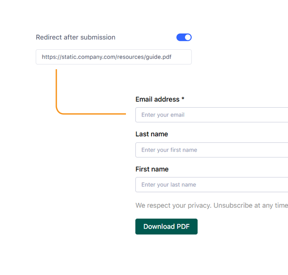 Send visitors to any page after they submit a form, whether it’s a downloadable resource, thank-you page, or custom URL.